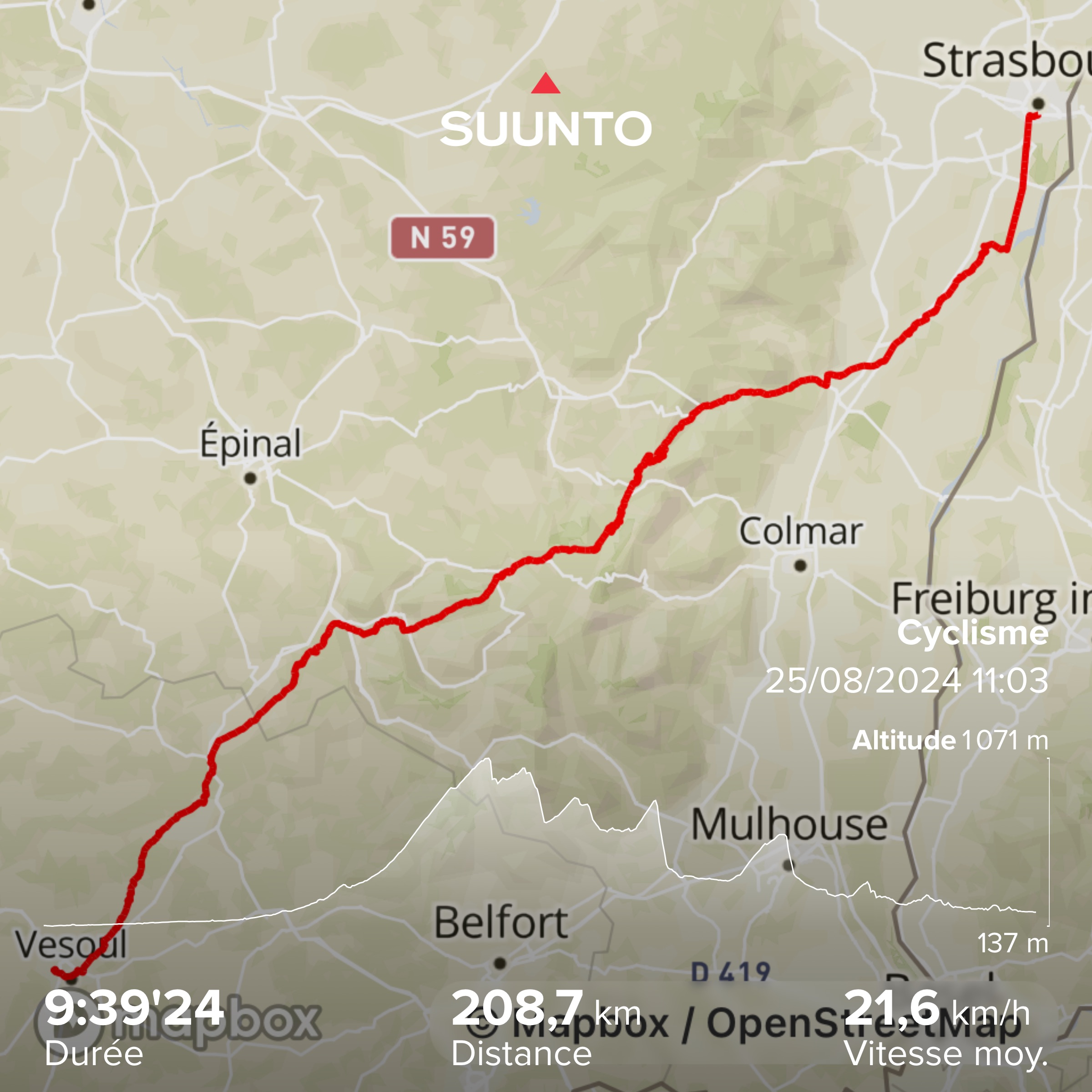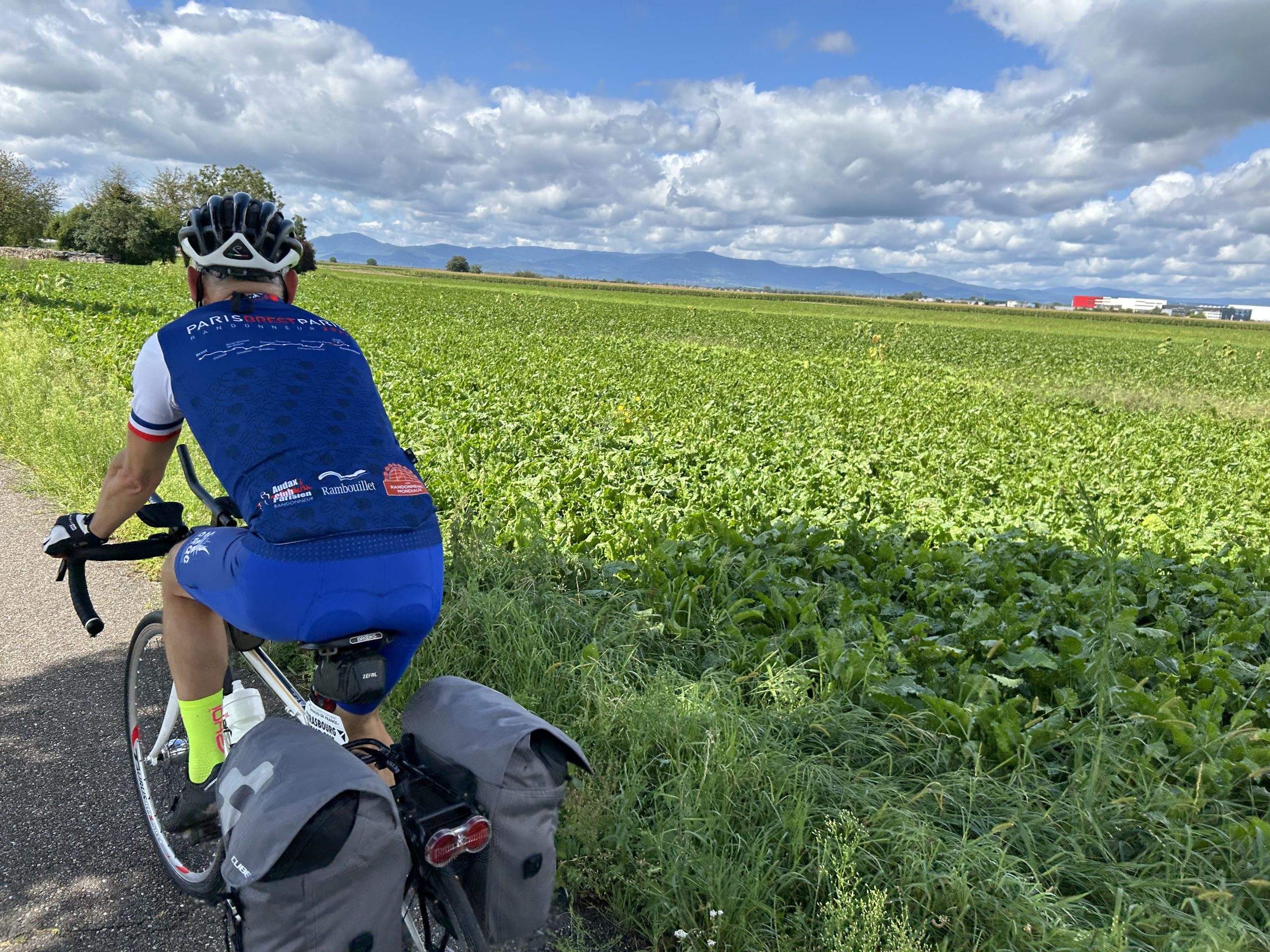 Nous quittons la piste cyclable pour traverser Erstein, kogenheim, tout en apercevant au loin le massif Vosgien, que nous avons choisi de traverser.