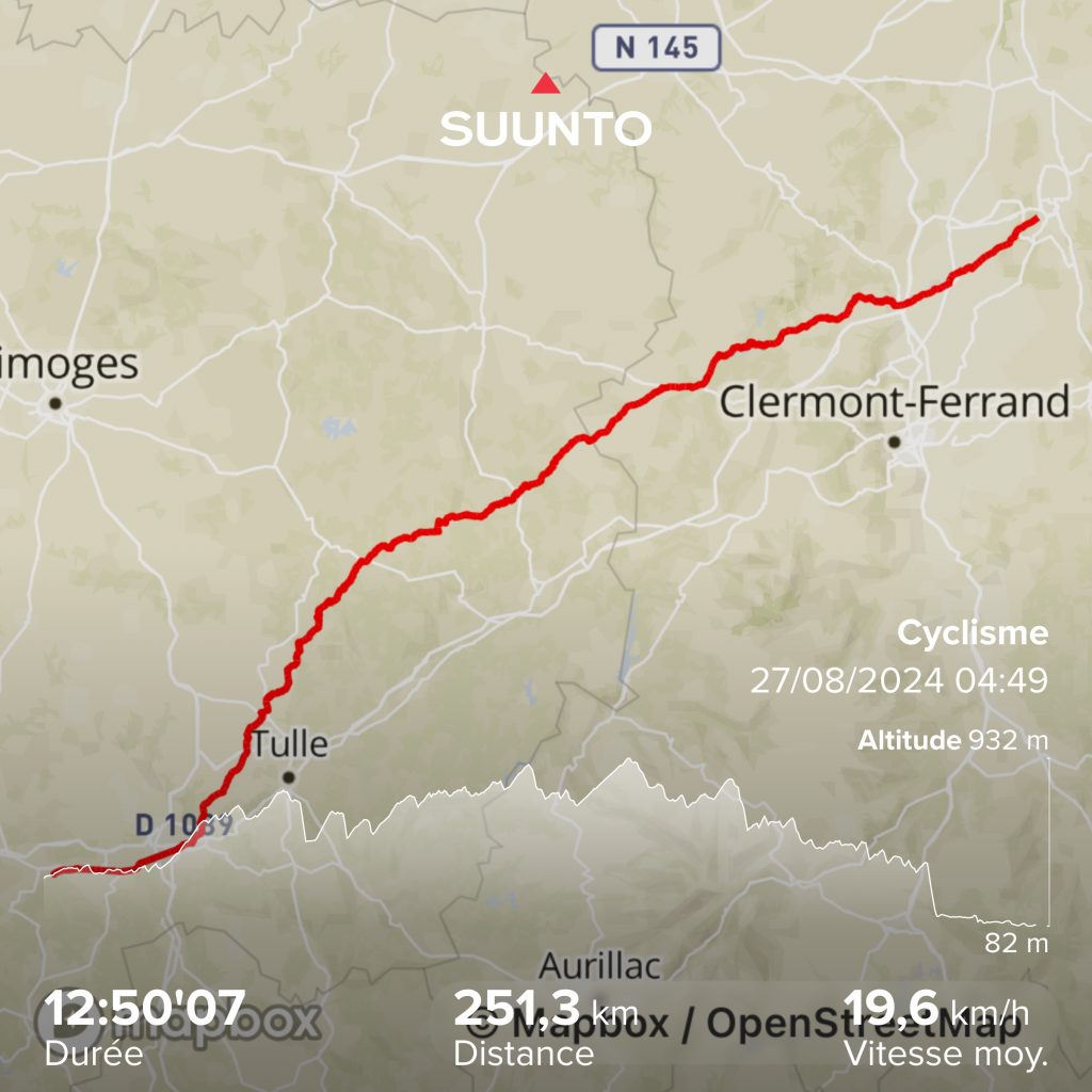 Nous reprenons la route à 4h40 dans le froid. Le début d’étape est plat, puis à partir de Combronde nous montons à 700 mètres d’altitude. Nous sommes en Auvergne sur des petites routes sans circulation : Charbonnières les vieilles, Manzat, saint Georges de Mons.