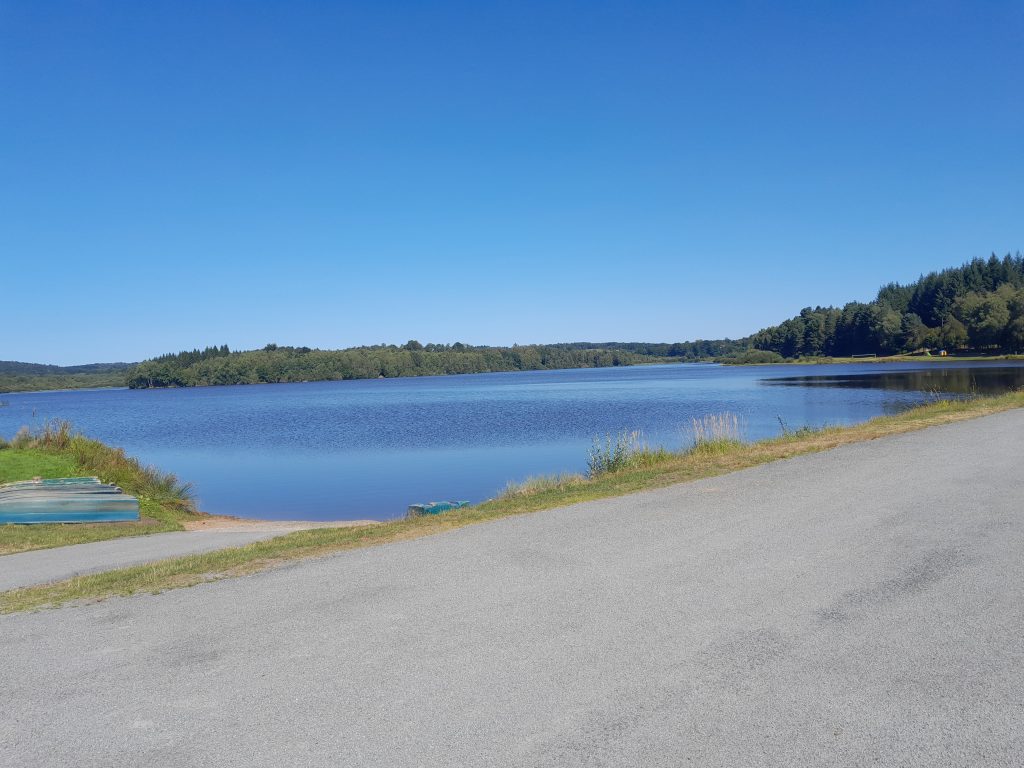 A partir de 10 heures la température devient plus clémente pour pédaler dans les Combrailles : Pontaumur, condat en combrailles, Giat. Nous ne sommes pas embêtés par les voitures, et l’Auvergne est magnifique sous le soleil. Nous passerons par Flayat, l’étang de Méouze, Saint Oradour de Chirouze, puis nous atteindrons La Courtine, pour la pause déjeuner. Je passe faire mes achats dans la supérette coté magasin, avant de rejoindre Mathieu coté bar, pour me restaurer.