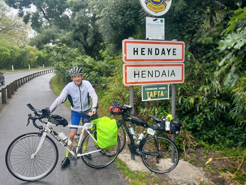 Les orages se calment et nous arrivons à Hendaye, rue de la Béhobie, au commissariat de police . L’agent nous informe que le lieu de pointage des carnets a changé. Maintenant , le pointage s’effectue en centre ville au bureau de la police municipale, en face de l’hôtel de ville ! Nous repassons devant la gare, lorsque je crève pour la troisième fois de la diagonale, de la roue arrière. J’essaye de regonfler mon pneu sans réparer, car nous sommes à moins d’un kilomètre du centre ville, mais la pression ne tient pas. Il y a un bout de verre dans le pneu!