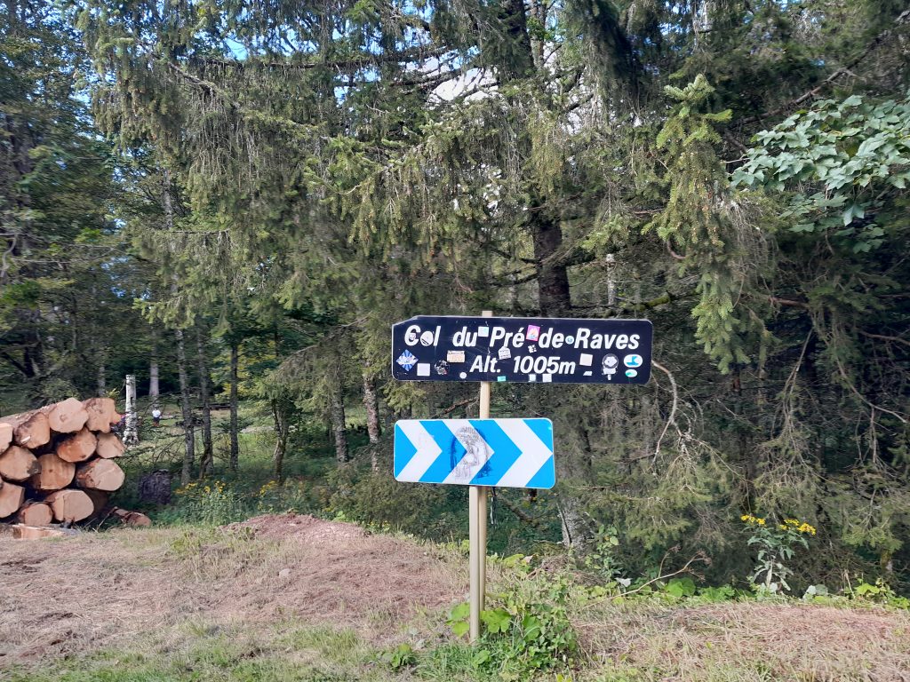 A partir de Sherviller, nous quittons la plaine, pour commencer progressivement l’ascension du premier col de la journée. C’est également la première crevaison de la journée, qui est à créditer sur mon compte. La vallée se resserre, les premiers vrais pourcentages arrivent et Mathieu n’est plus là. Il fait beau et il s’est sans doute arrêté pour mettre de la crème solaire ? Je continue ma route, nous avons la même trace dans nos GPS respectifs et il roule plus vite que moi. Effectivement il ne tarde pas à me rattraper et me dépasser . Après 11 km d’ascension, la vue du col des Bagenelles (905 m) est magnifique. Nous continuons l’ascension dans la forêt en passant par le col du pré de Raves (1005 mètres), puis le col du Bonhomme (949 mètres).