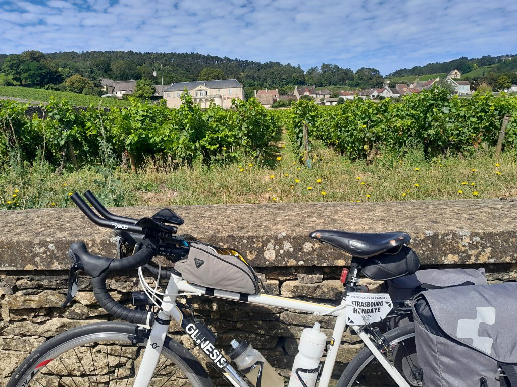 Nous faisons une halte sur la place à coté des Hospices de Beaunes . Pendant que Mathieu remplace son pneu et se restaure, je vais acheter de quoi me restaurer. Au niveau de l’alimentation, nous avons 2 modes de fonctionnement . Adepte de l’autonomie alimentaire, Mathieu emporte la grande majorité de son alimentation dès le départ. Pour ma part, j’achète mon ravitaillement au fur et à mesure, tout en ayant des barres énergétiques dans mes sacoches.