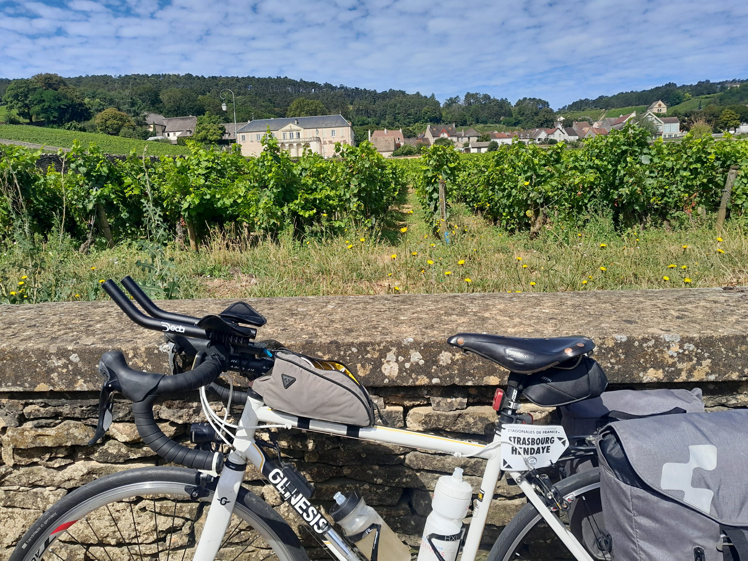 Nous quittons Vesoul par la côte qui mène à Andelarre , avec les nombreux camions qui ont commencé à circuler, en ce lundi matin. Ensuite le relief s’adoucit. Dans la matinée nous passerons par Bucey lès gy, Auxonne, Charrey sur Saône, Argilly. Nous arriverons à Beaune avant midi, ce qui permettra à Mathieu d’acheter un nouveau pneu chez un vélociste.