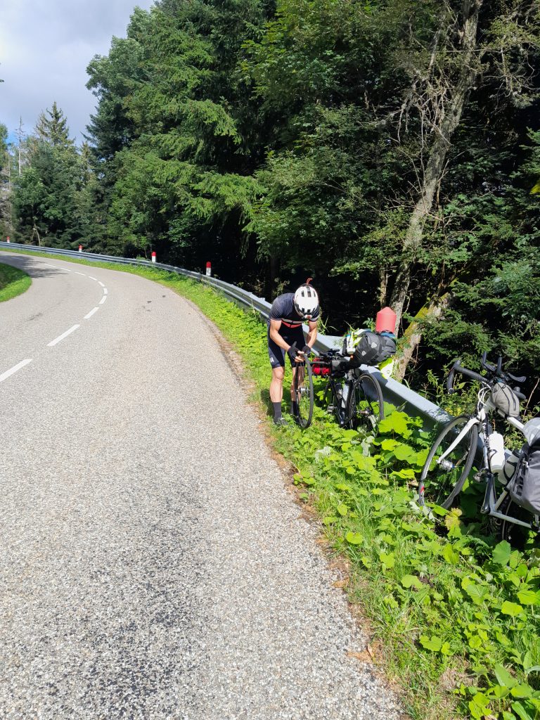 Pour éviter l’hernie, je colle une rustine à l’intérieur du flan pour tenter de limiter l’aggravation de la déchirure. Nous repartons 30 min plus tard. J’ai l’épée de Damoclès au dessus de ma tête. Nous descendons après le col de Loucpach, par la jolie route forestière du Rudlin. Elle est très abîmée et secoue vivement ma monture fraîchement réparée. Je suis particulièrement inquiet par mon pneu. J’informe mon compagnon qu’il poursuivra, peut-être, l’aventure seul si mon pneu, durant la nuit venait à céder. Je relativise ! C’est une réparation pneumatique envisageable, Ce n’est pas une casse mécanique ou un problème physique pénalisant.