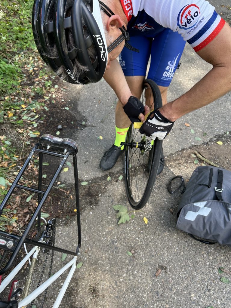 Km 53 J’entends derrière moi « crevé !» Pardi ! Mon compagnon est déjà fatigué ? Pensais-je. Non ! C’est son vélo qui est crevé ! Et oui déjà !! Une chambre à air neuve, une photo pour témoigner de cet incident. 15 min dans la vue…