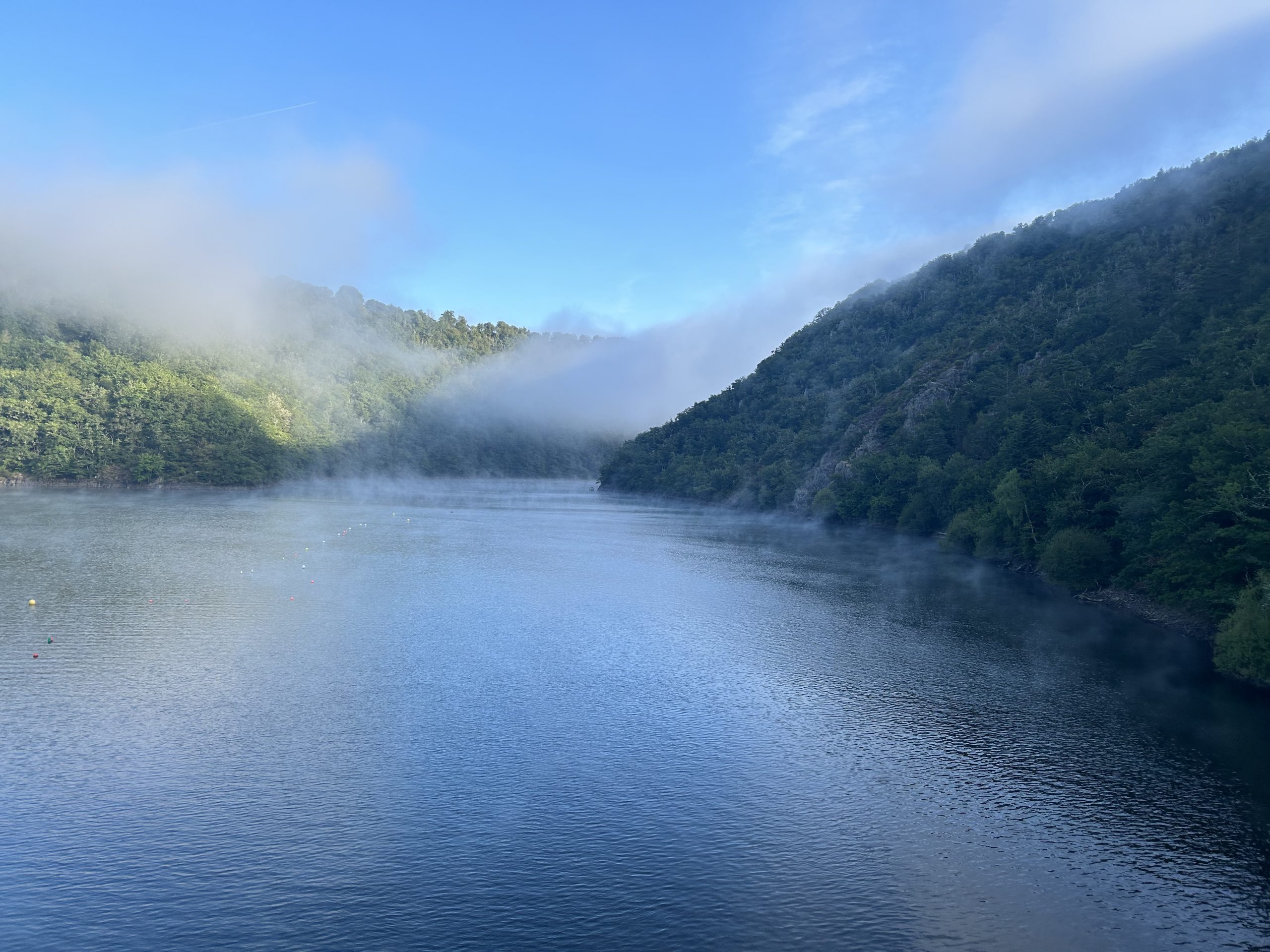 Après Ancizes, Nous entamons une belle descente. La route surplombe la retenue d’eau de Fades Besserves (63). Une belle atmosphère y règne. L’évaporation matinale, est perceptible. Elle est rendue possible par la différence de température entre la chaleur de l’eau et les basses températures de l’air. Une légère brume s’en dégage, apportant une ambiance cotonneuse. Ces beaux paysages captent notre attention quand la route s’élève dans les pentes de 10%, après le Pont du Bouchet, en bord du lac.