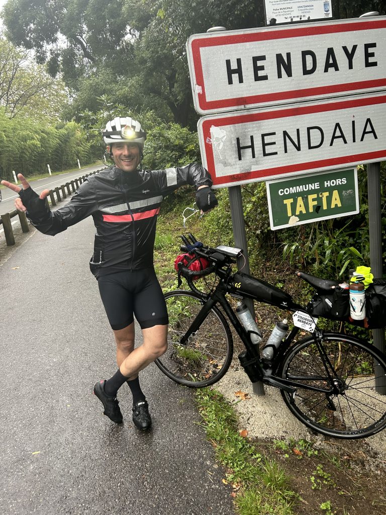 La pluie a grandement diminué d’intensité lorsque nous arrivons au panneau d’entrée d’Hendaye. J’insiste pour prendre une photo du panneau en guise de contrôle. C’est une façon de marquer cette 3ème diagonale.