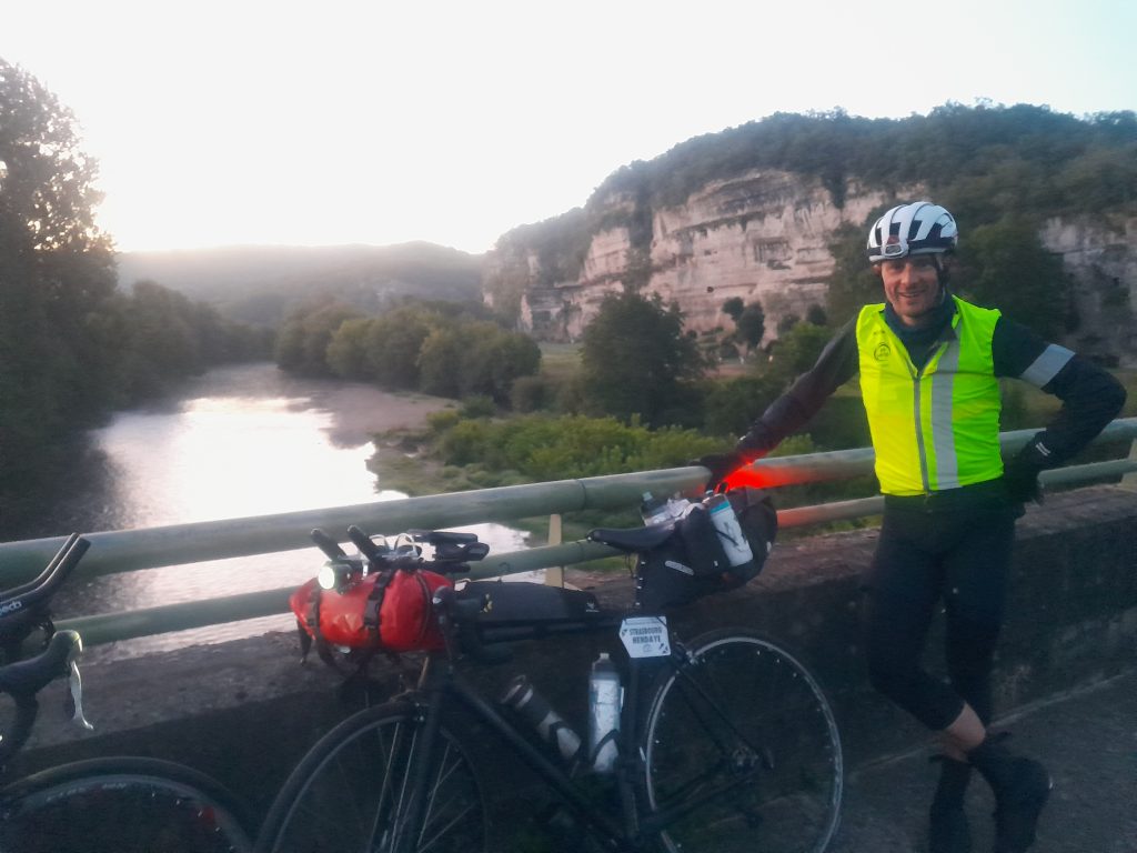 Un peu avant 8h00, km 800, notre pause matinale se déroule à Le Bugue en bord de Vézère pour satisfaire nos appétits. Nous traversons à 8h45 la Dordogne.